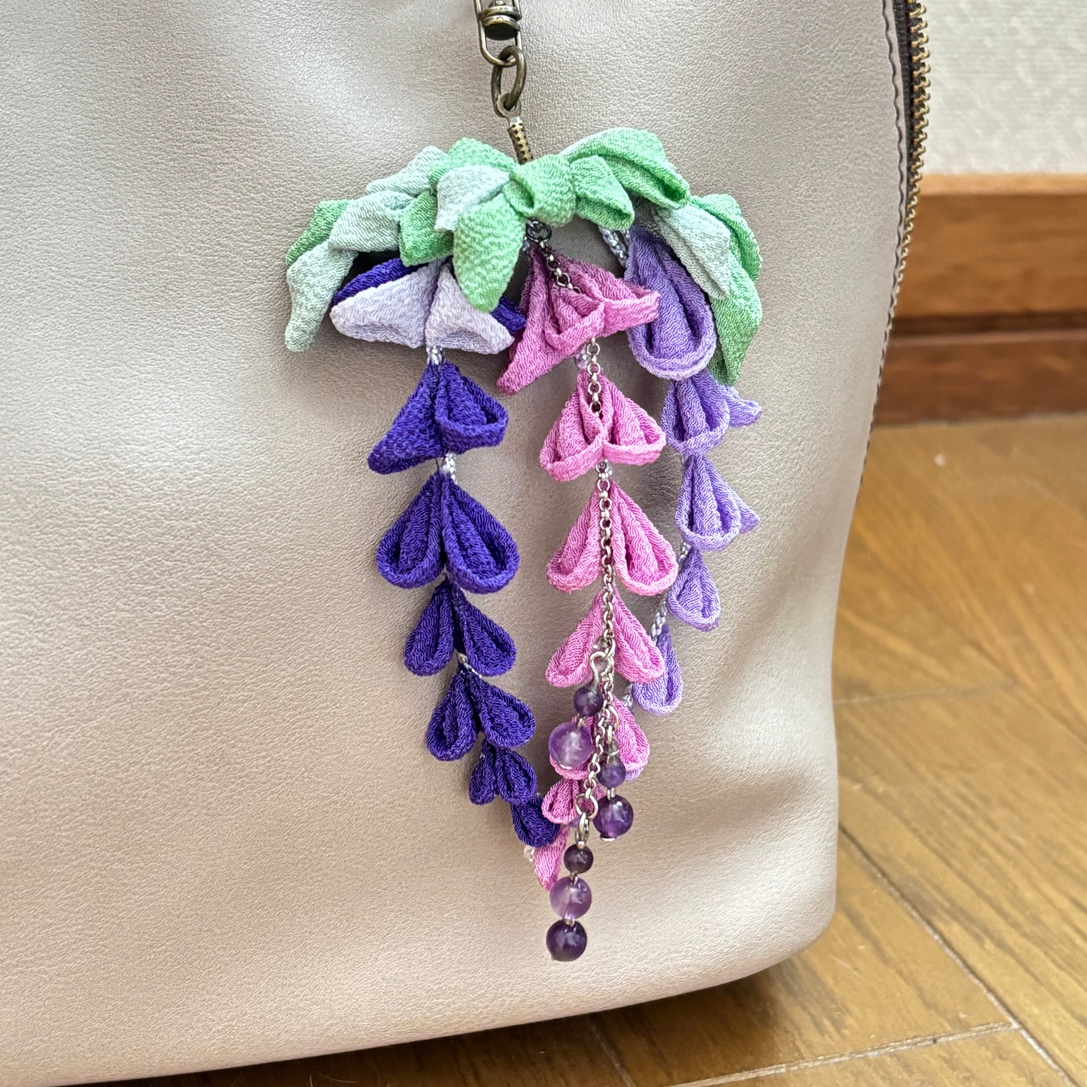 つまみ細工で藤の花のキーホルダーを作成しました。チャームとして天然石のアメシスト4ミリを4つ、3ミリを3つ使用しました。